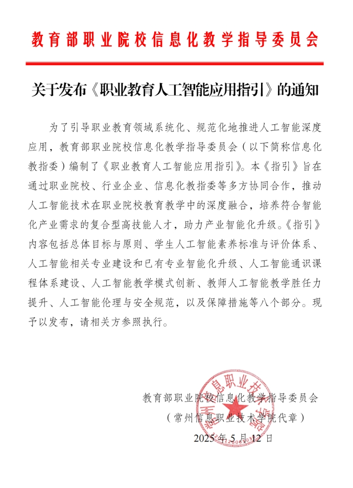 引导职业院校开展适应智能时代的教育教学改革,推进人工智能技术与职业教育教学的深度融合,培养具备人工智能素养及职业能力的技术技能人才,助力产业智能化升级。