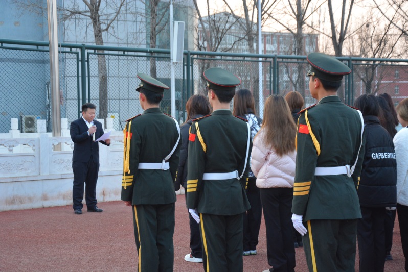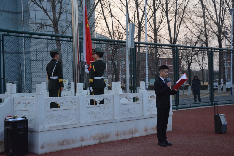 上午七时,升旗仪式正式开始。国旗班在阳光的照耀下,亮出坚定的目光,五星红旗冉冉升起,迎风飘扬,学院师生代表面向国旗行注目礼,齐唱中华人民共和国国歌,深怀对祖国最诚挚的热爱和崇高的敬意。