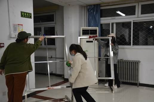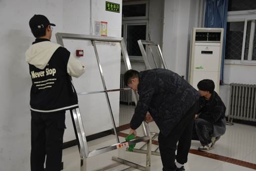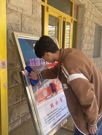 本次活动主要针对教一楼内宣传展板及展板架进行清洁,并在清理完成后清扫了教一楼门前宣传区台阶上的卫生死角。他们有的用双手支撑挡板展架,有的拿着抹布清洁边框,有的清除展板架上的胶带印记。活动过程中,同学们积极参与,互相配合,分工明确,井然有序,在轻松愉悦的气氛中,用自己的行动为校园宣传平台增添了一份清新。