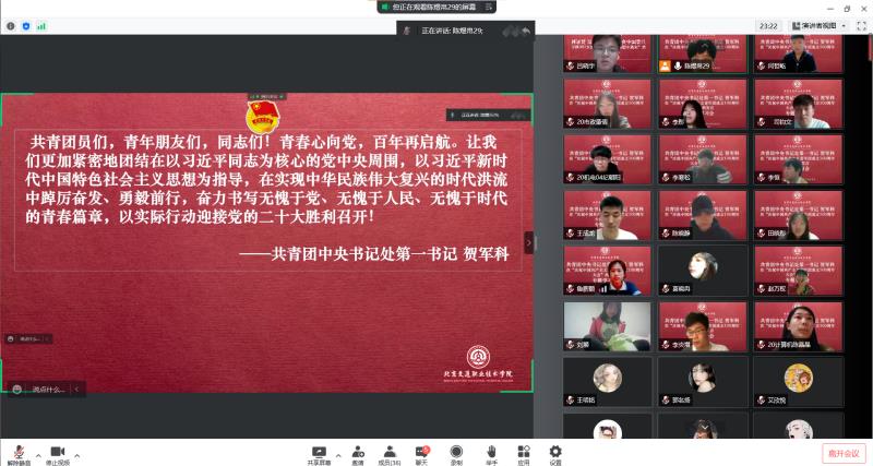 为学习贯彻习近平总书记“庆祝中国共青团100周年大会”重要讲话精神,带领全院做好会议精神的践行者、学习者,深刻体会总书记重要讲话精神,我院团委组织开展会议精神热议专题学习系列活动,组织团学干部通过线上学习的方式又共同学习共青团中央书记处第一书记贺军科同志在庆祝中国共产主义青年团成立100周年大会上的发言。