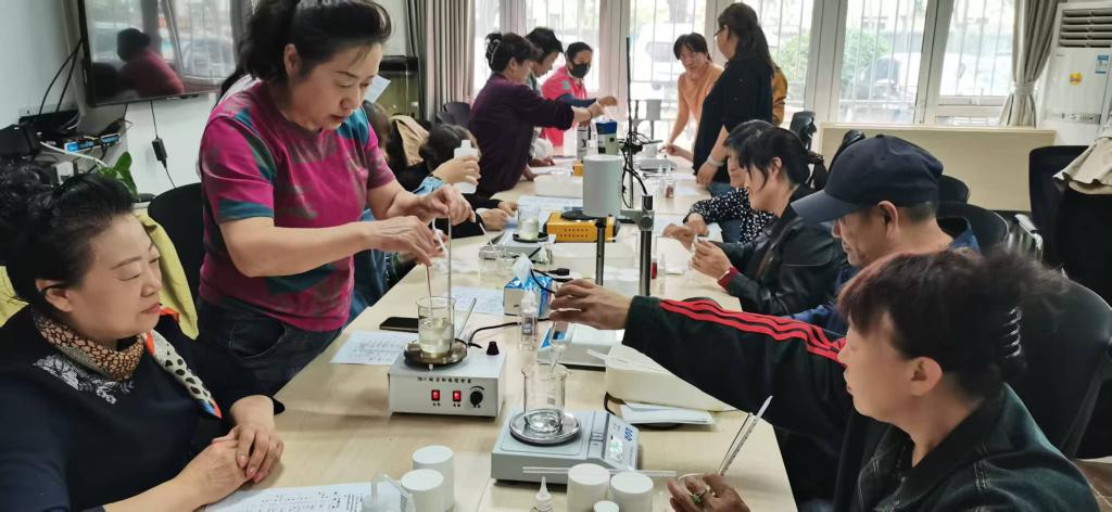 活动现场,学院管理系化妆品经营与管理专业的高润副教授详细讲解了护手霜的制作原理和步骤,包括原料的选择、配比、混合以及封装等环节。在老师的指导下,参与者们纷纷动手,将甘油、植物提取物等原料按照比例混合,制作出属于自己的护手霜。
