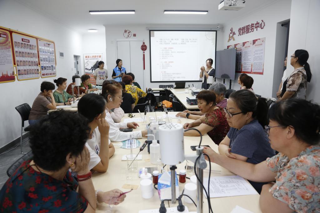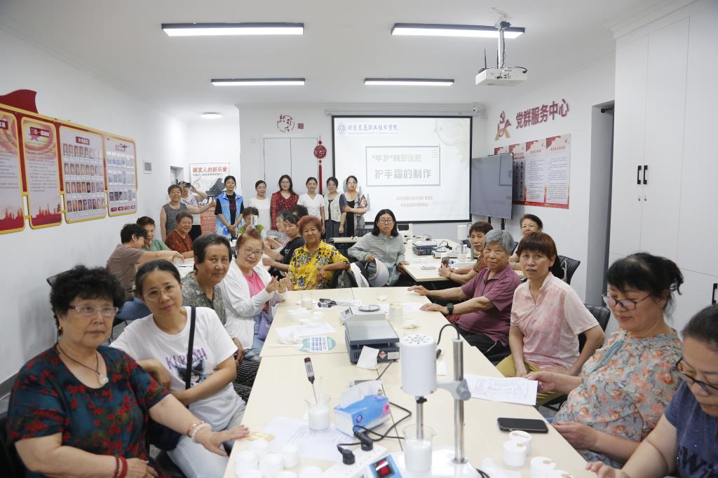 活动现场,化妆品经营与管理专业高润副教授为居民们详细讲解护手霜的成分、功效及制作流程,居民们亲手调配原料,体验从乳化到灌装的全过程。活动不仅普及了科学护肤知识,更通过互动实践拉近了邻里距离。