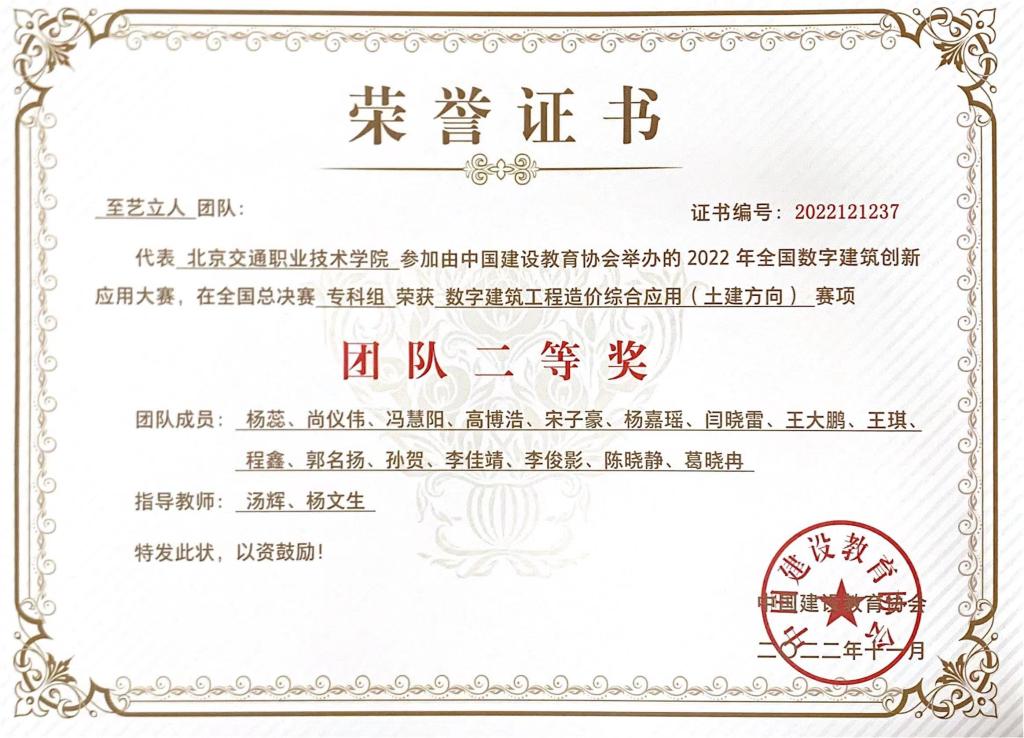 本次大赛我院参加了赛项1数字建筑工程造价综合应用土建方向,该赛项考试科目为建筑工程BIM计量、建筑工程计价。重点培养学生建筑工程BIM计量、招标文件编制及投标文件编制等能力。本次大赛分为全国高校预选赛、全国总决赛两个环节。从2022年3月至11月,经过长达半年的训练,我院路桥系工程造价专业16名同学荣获团队二等奖荣誉称号,杨蕊同学荣获总决赛百强荣誉称号。