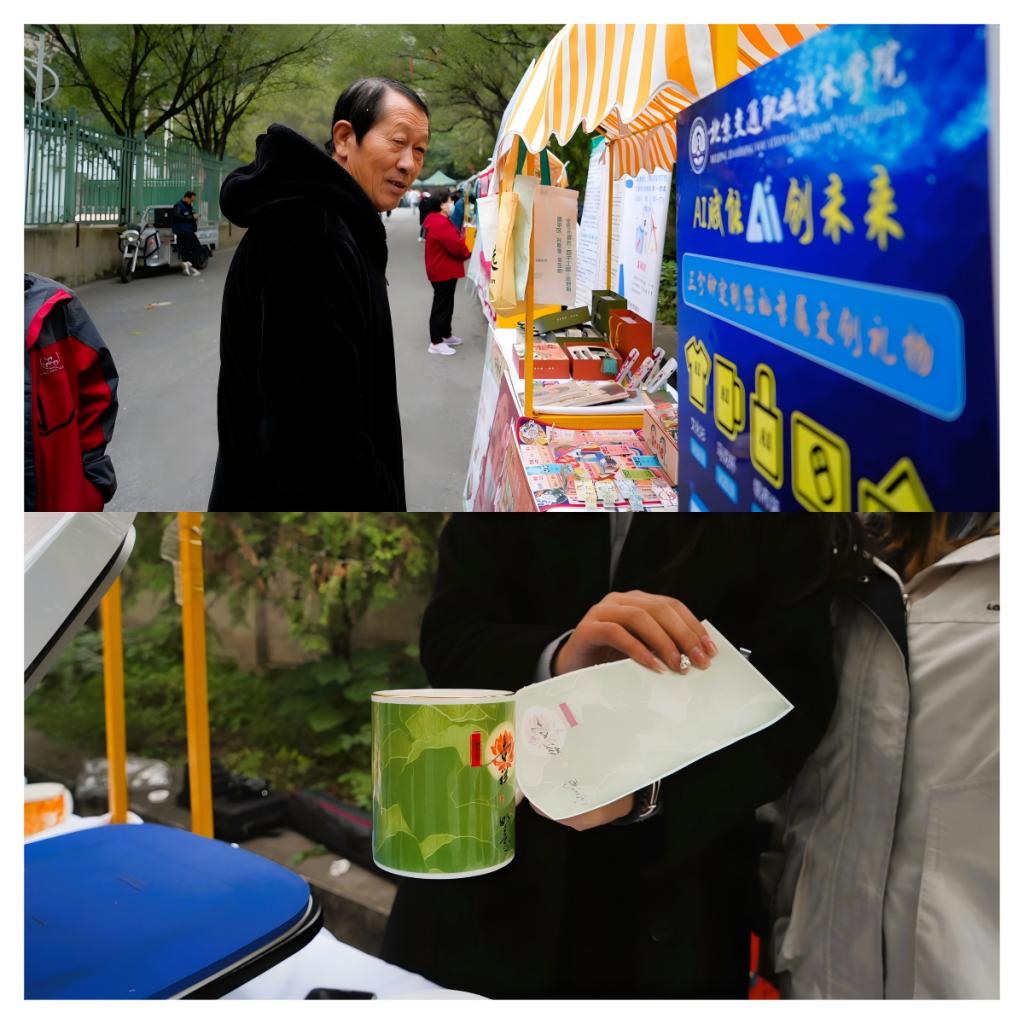 活动中,路桥系师生不仅展示花塔村文创,还亮相了为昌平其他特色村设计的文创成果。并且师生现场运用AI转印设备按需为游客定制专属文创,实现文化与个性化需求的结合。
