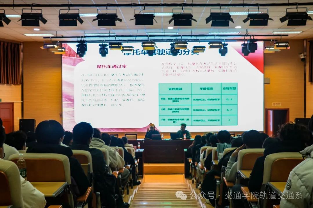为进一步强化学生交通安全意识,切实提升学生的自我保护能力,轨道交通系于2024 年 11 月 28 日 14:00,在报告厅举行了“摩托车安全驾驶”交通安全讲座。北京石碳纪梁杨老师、门红昌老师、郝振华老师、轨道交通系全体班主任出席会议。