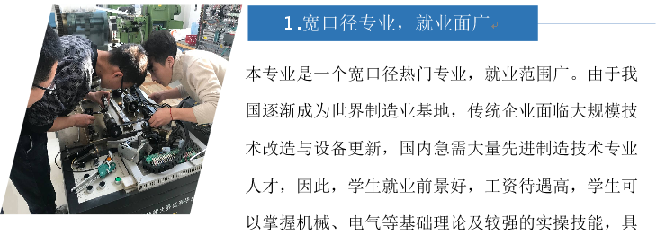 本专业是一个宽口径热门专业,就业范围广。由于我国逐渐成为世界制造业基地,传统企业面临大规模技术改造与设备更新,国内急需大量先进制造技术专业人才,因此,学生就业前景好,工资待遇高,学生可以掌握机械、电气等基础理论及较强的实操技能,具备一技之长。