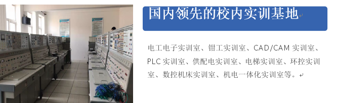 电工电子实训室、钳工实训室、CAD/CAM实训室、PLC实训室、供配电实训室、电梯实训室、环控实训室、数控机床实训室、机电一体化实训室等。