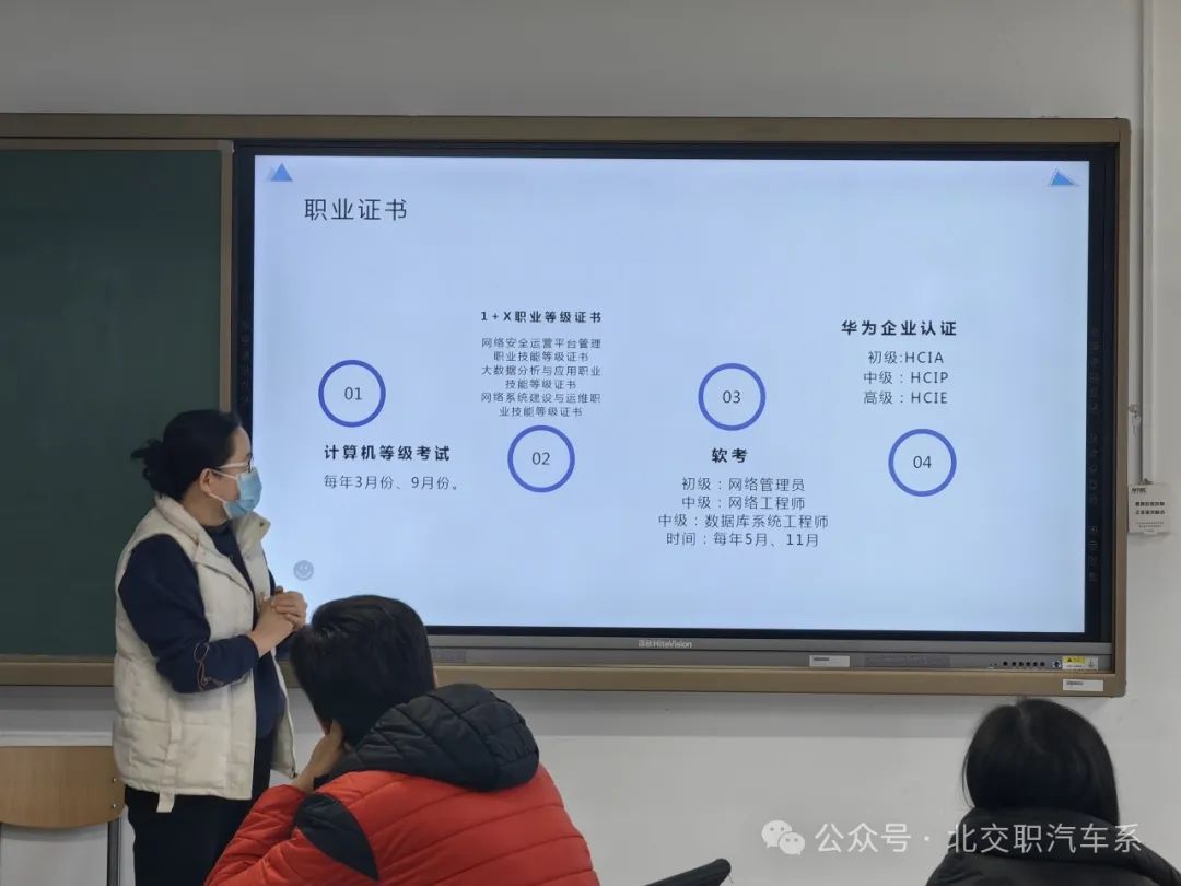 会上,王会霞老师首先为大家介绍了计算机专业的专业背景以及专业就业面向。随后又带大家了解了计算机专业与华为、博海迪、锐捷等相关企业合作的情况。还为大家展示了计算机专业的相关证书,并解释了相关证书的考取流程以及对相关学生就业的影响。最后,为大家说明了由平台基础课程以及专业拓展课程和核心课程组成的计算机专业课程体系。
