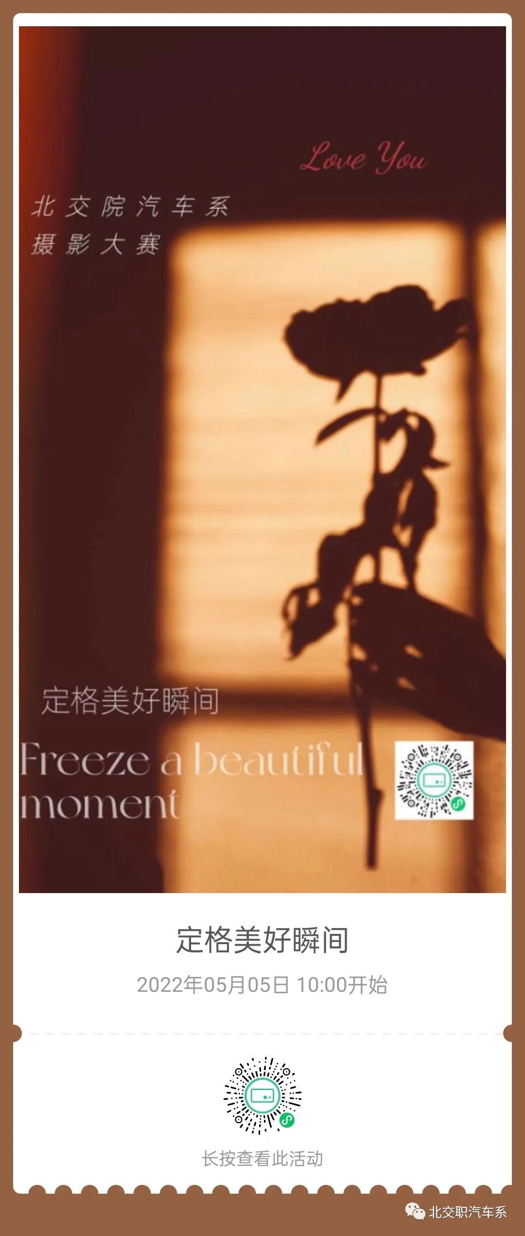 伟德国际1949官网汽车系现举办一场以“定格美好瞬间”为主题的线上摄影大赛。记录身边趣事,分享美好瞬间。欢迎大家踊跃报名参加。