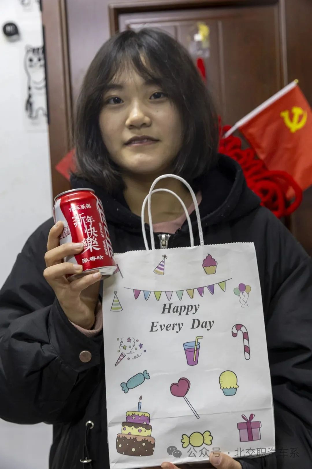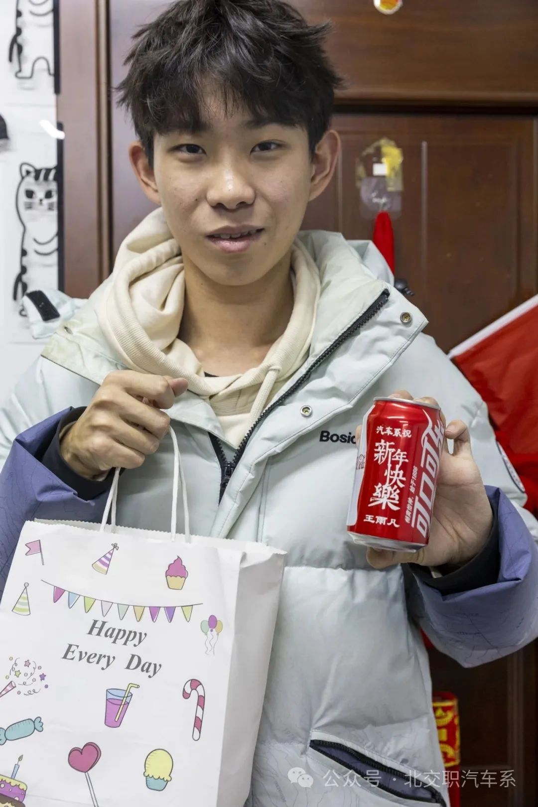 汽车系为大家特别“定制”了专属于各自的元旦可乐和元旦礼袋,内含精心挑选的小礼品、零食和祝福卡片,还有汽车系每个人独有的特制可口可乐饮料,每个人的名字都出现在上边,既可口又可乐。希望通过这份礼物能够传达汽车系对每名同学的诚挚祝福和感谢之情。同学们都能感受到汽车系对大家的祝福,正所谓“ 礼轻情意重”每个精心准备的礼物都值得珍藏,即使并不昂贵,但是那份心意和节日带来的欢乐是无比珍贵的。