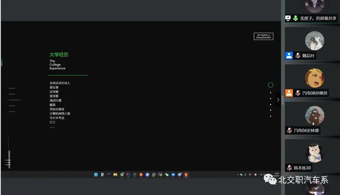 为教育引导学生将具备优良品德的大国工匠、能工巧匠、劳动模范、行业能手、创业之星等作为学习、追赶和立志超越的成才榜样。六月九号我们特邀16级汽车系计算机应用技术专业的优秀毕业生张钊玮学长以线上会议的形式来为我们汽车系全体学生进行了一次极具意义的“寻访职业榜样”主题学习教育座谈会。