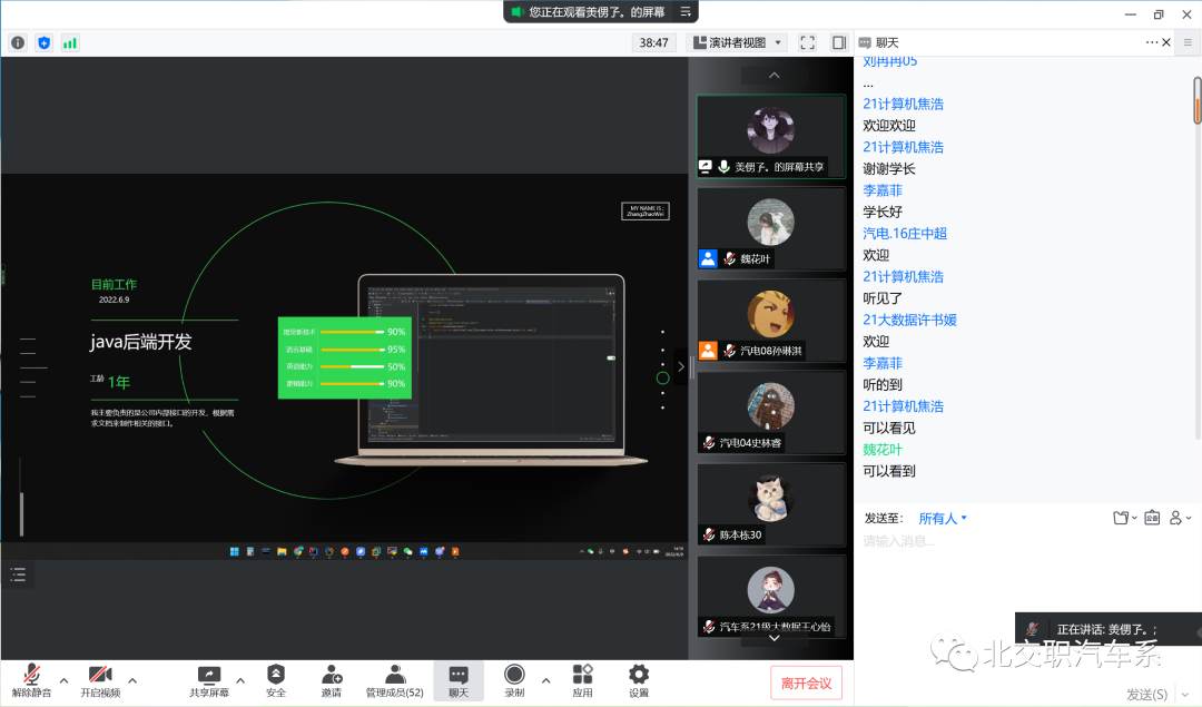本次邀请到的学长曾担任系团总支副书记、班级团支书,他在会议上提到他在校时经常参加院里举办的各类活动和比赛,在学习之余也会积极地丰富自己的大学生活,通过这样来学习更多的技能,同时他也鼓励我们要在保证自己的学习成绩的基础上多多参加一些有意义的活动以此来丰富自己、提升自己。毕业后他经过培训顺利进入公司,现在主要负责公司内部接口的开发。