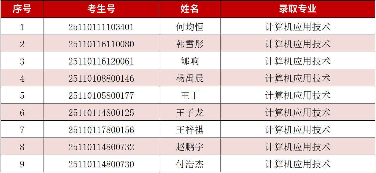 2025年北京高职自主招生第一次招生录取工作已圆满结束。我院自主招生录取工作小组根据考生基础成绩及面试成绩等因素进行综合评定。经我院自主招生领导小组审议,现将我院预录取名单进行公示,公示时间:2025年4月16日—18日。