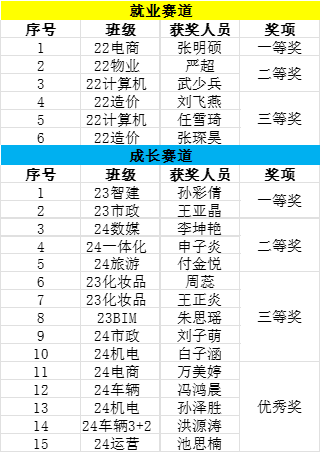 最终,就业赛道,22电商张明硕等6位同学分获一、二、三等奖;成长赛道,23智建孙彩倩等10位同学分获一、二、三等奖。未来,学院将不断完善赛事机制,鼓励更多学生参与其中,全面推进“以赛促学、以赛促教、以赛促就业”的教育理念。创新教育方式,激发学生的学习热情,从而切实提升他们的综合素质和实践能力。同时,学院将致力于打造一个全面、立体的职业生涯教育体系,构建更为紧密的校企合作关系,创建职业发展的广阔平台,为毕业生提供更多优质的实习和就业机会,努力适应市场需求,提升就业竞争力,全力促进毕业生高质量充分就业。